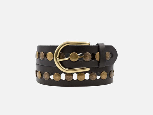 The studded-belt has been making waves in and around the fashion world. Meet the premium buffalo leather belt Demi that comes with an oval buckle, sporting antique round studs. Fusing western and rock n' roll aesthetics, this belt for women pairs perfectly with any...